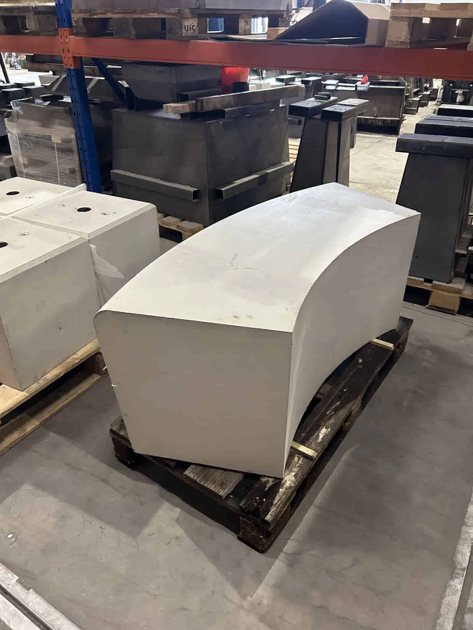 Bovenstaande betonnen bank is van zelfverdichtend beton gemaakt en weegt 714 kg. De bank heeft een lichte ronding en is 136,6 cm lang. De hoogte is 50 cm en de diepte 45/50 cm. Met 8 stuks kun je een ronde bank van 3,5 meter doorsnede maken (gemeten aan buitenzijde). In grijs of antraciet beton verkrijgbaar. Klik hier voor de detailtekening.