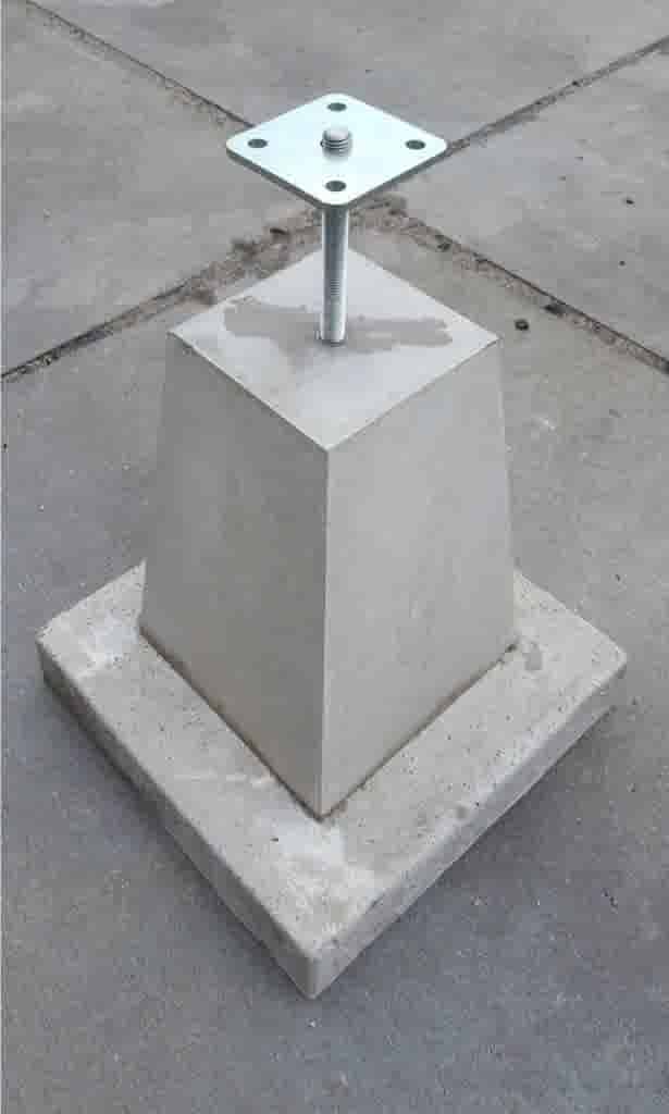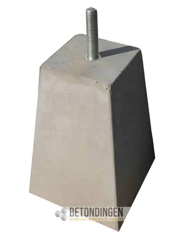 Hoogte: 45 cm Bovenkant: 18x18 cm Kopmaat: nvt Onderkant: 30x30 cm Vellingkant: nee Draadeind, schroefhuls of gat: 1 draadeind M16, verschillende lengtes mogelijk Gewicht: 60 kg Kleur: grijs Soort beton: zelfverdichtend beton -