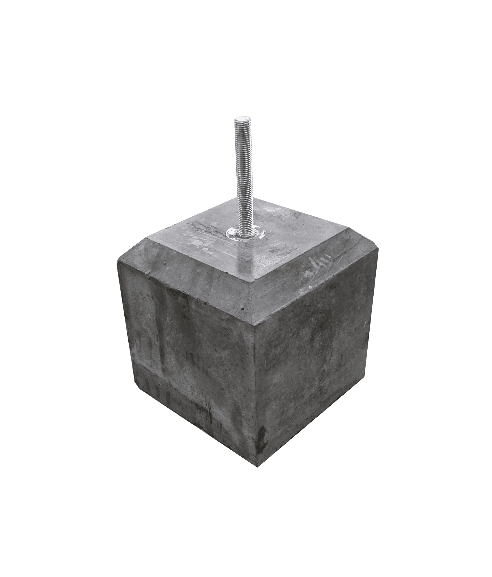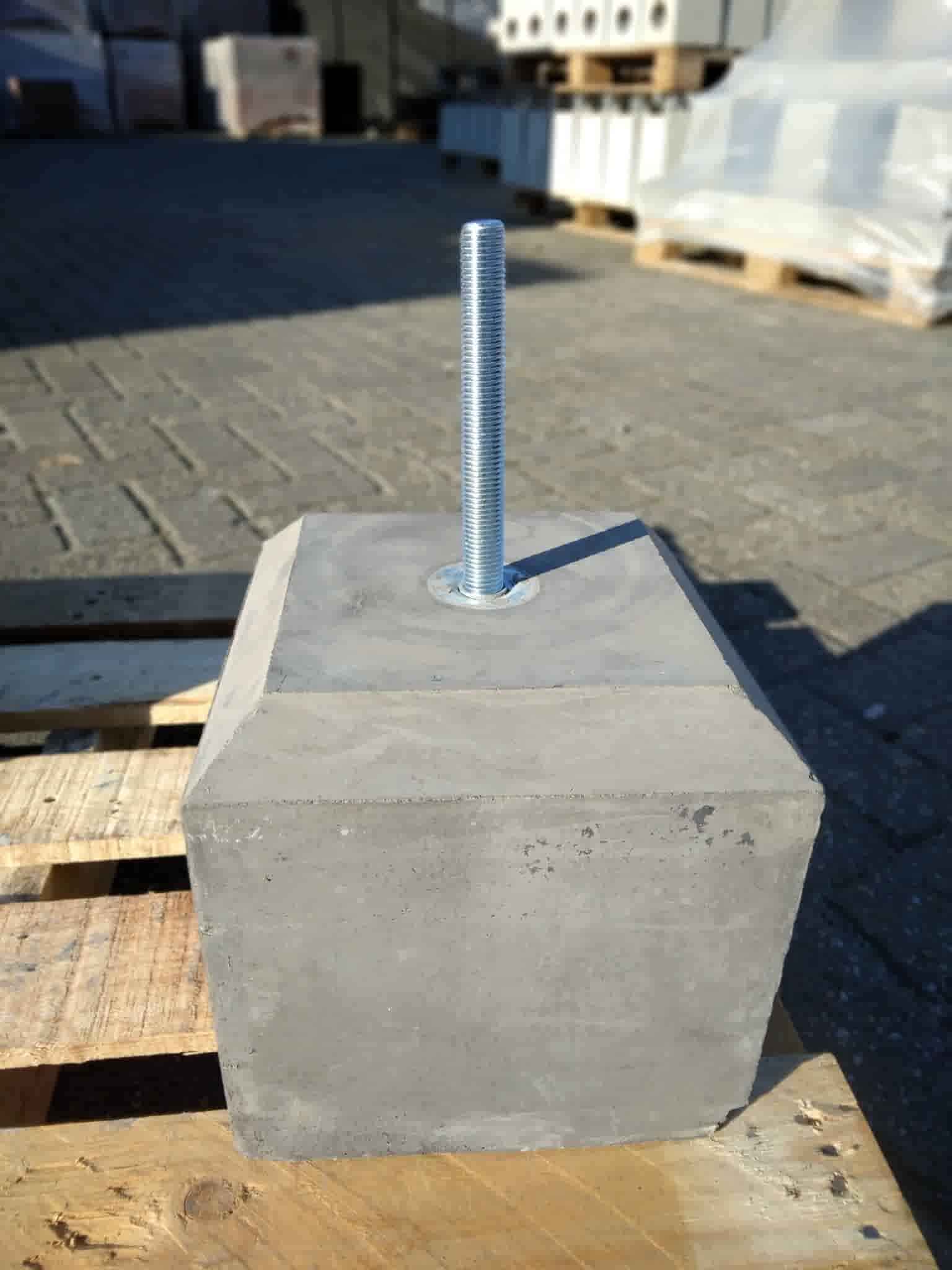 Hoogte: 20 cm Bovenkant: 20x20 cm Kopmaat: 15x15 cm Onderkant: 20x20 cm Vellingkant: ja Draadeind, schroefhuls of gat: 1 draadeind M16, steekt 10 cm uit Gewicht: 20 kg Kleur: antraciet Soort beton: zelfverdichtend beton -