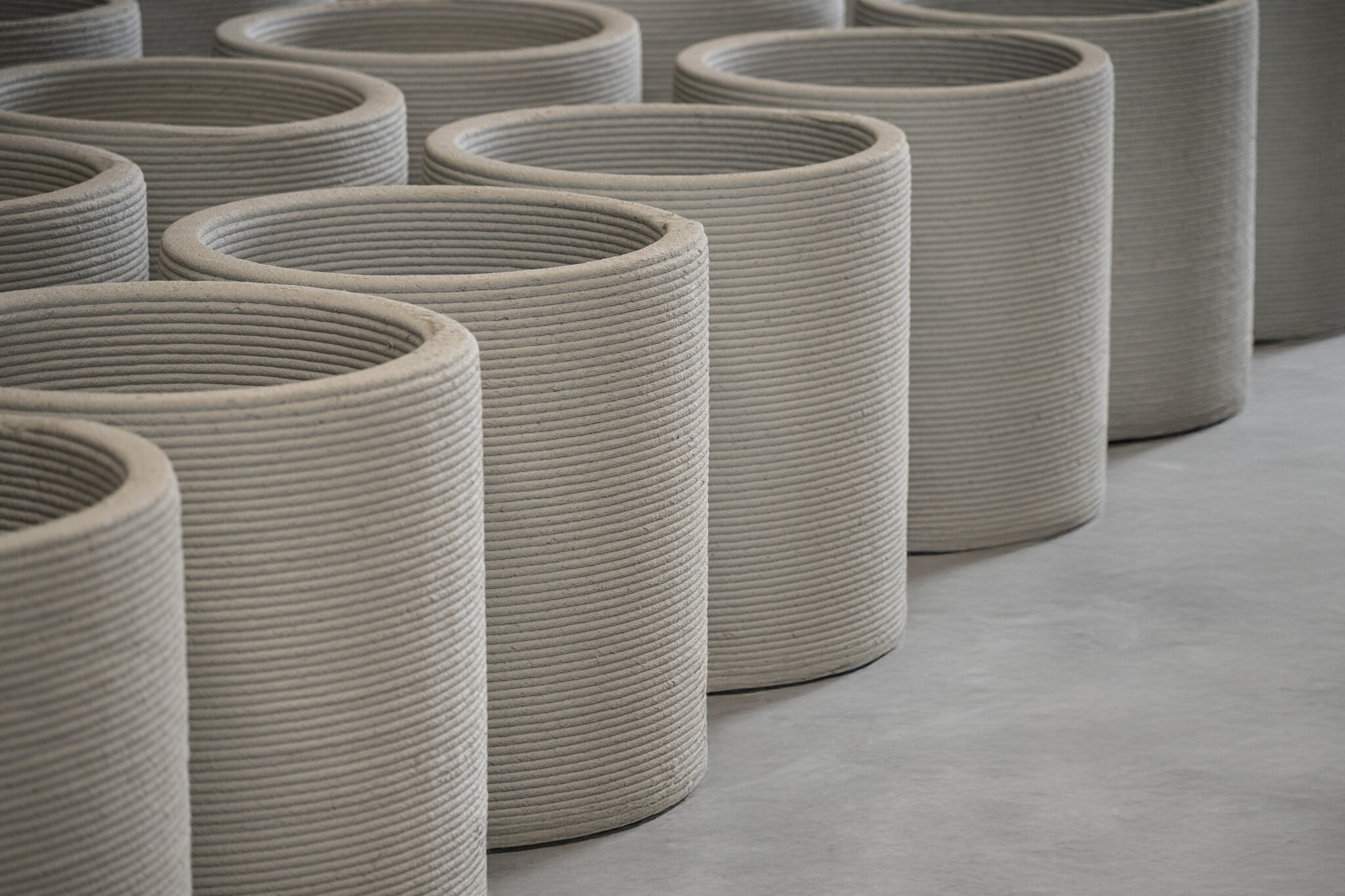 Voor onze 3D-geprinte producten gebruiken we een speciaal samengestelde betonmortel die zowel vloeibaar genoeg is voor de printer als snel uithardt. Additieven verbeteren de verwerkbaarheid, hechting en uithardtijd, zodat elke laag precies volgens ontwerp wordt opgebouwd. Onze industriële 3D-printer, voorzien van een printkop en een pompsysteem, transporteert de betonmortel vanuit de mengsilo naar de printkop en extrudeert deze laag voor laag, geheel volgens het digitale 3D-model.